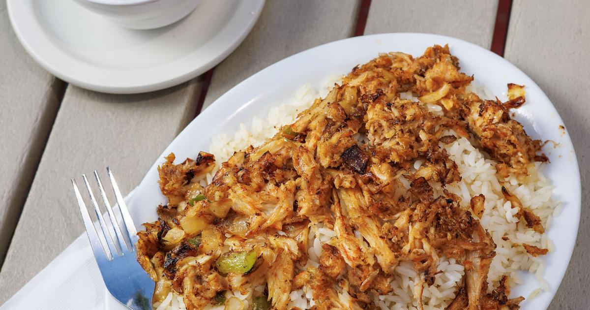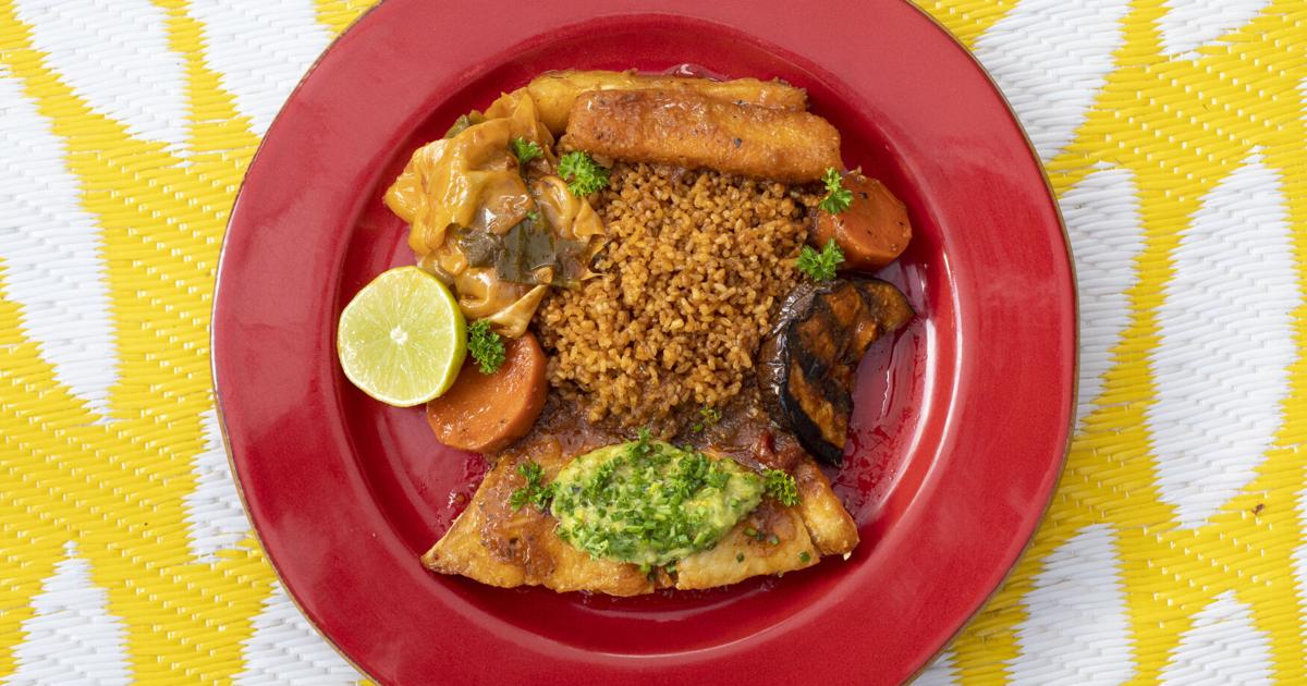 West African food like crab rice is served at Bintü Atelier in Charleston, SC. The owner, of Senegalese and French descent, previously cooked at Chez Nous.